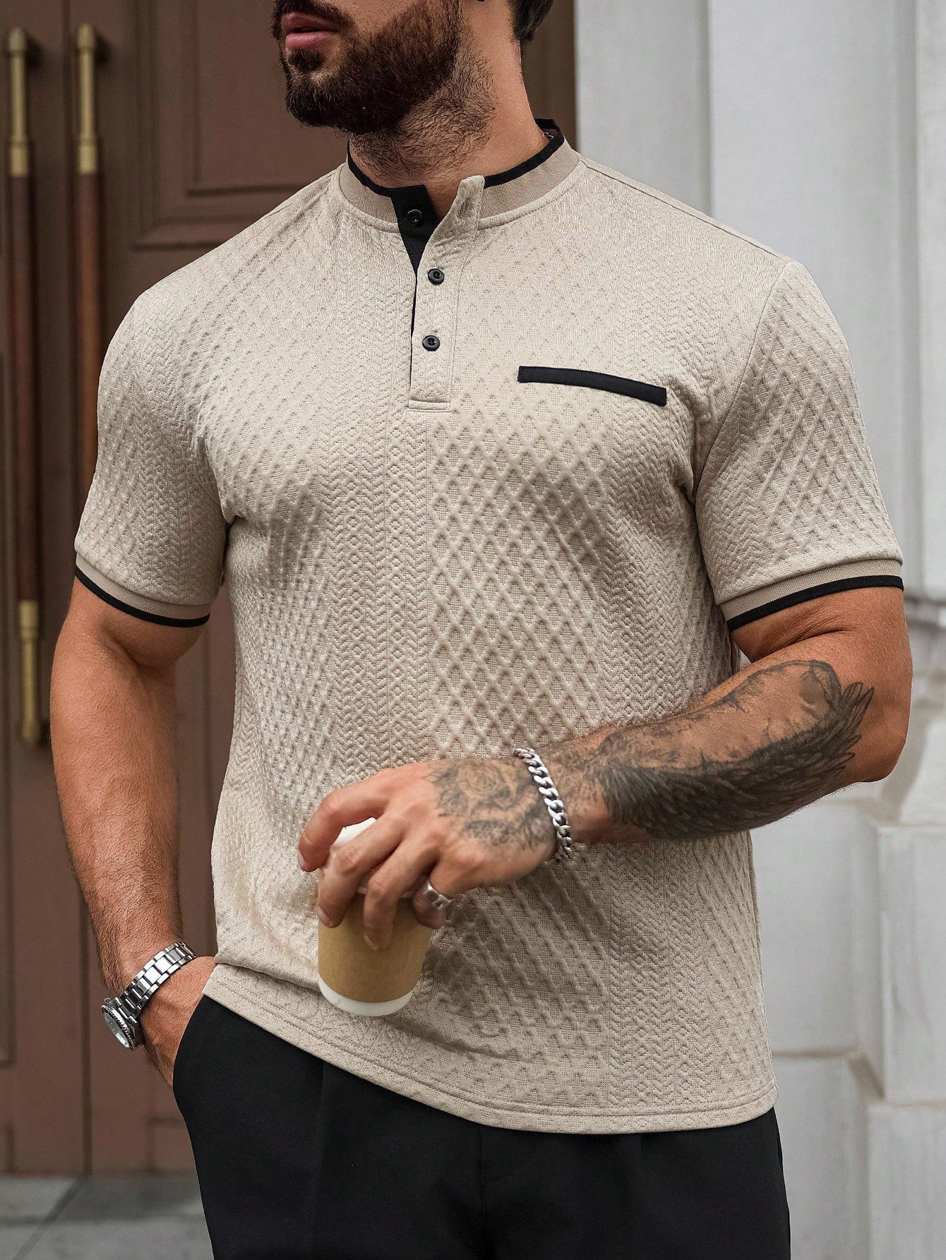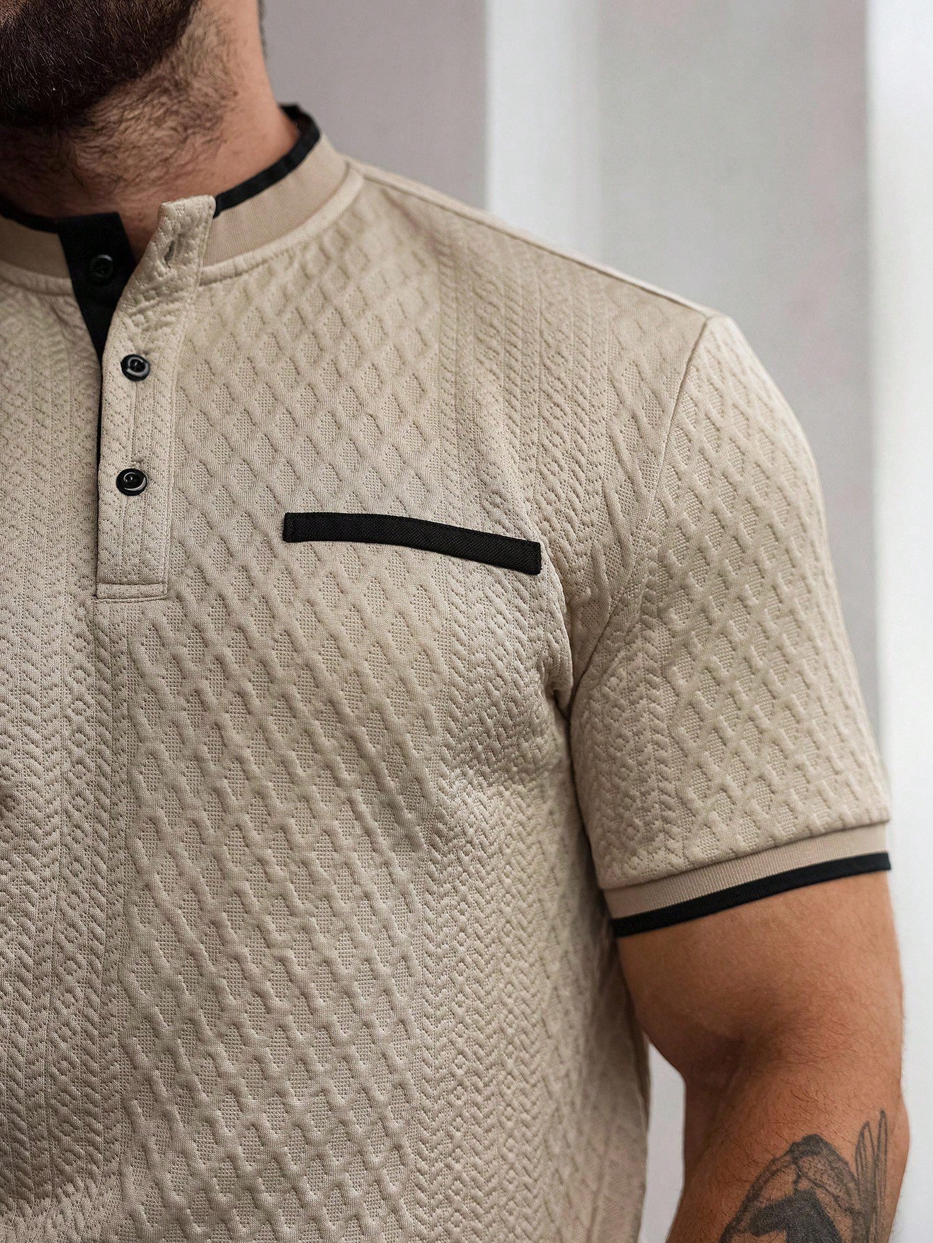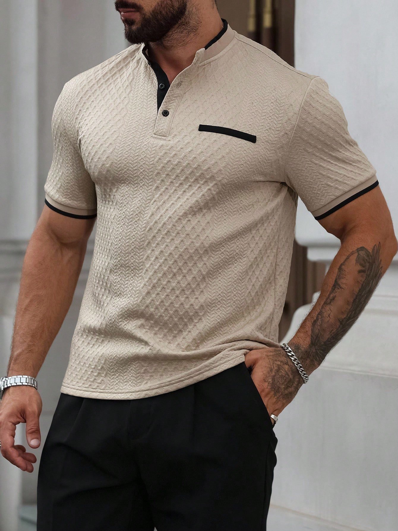 Original price was: $160.00.$80.00Current price is: $80.00.Men’s Apricot Knitted Polo Shirt – Stand Collar Colorblock Trim, Sports & Casual Summer Style