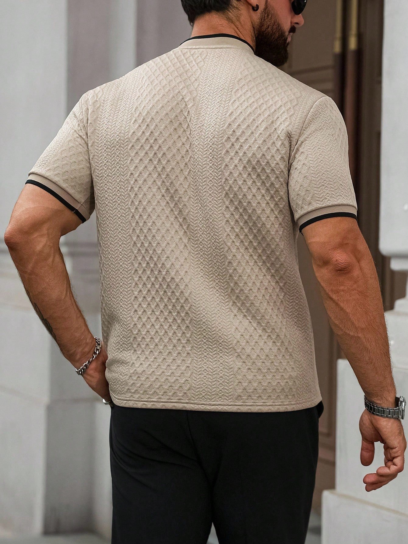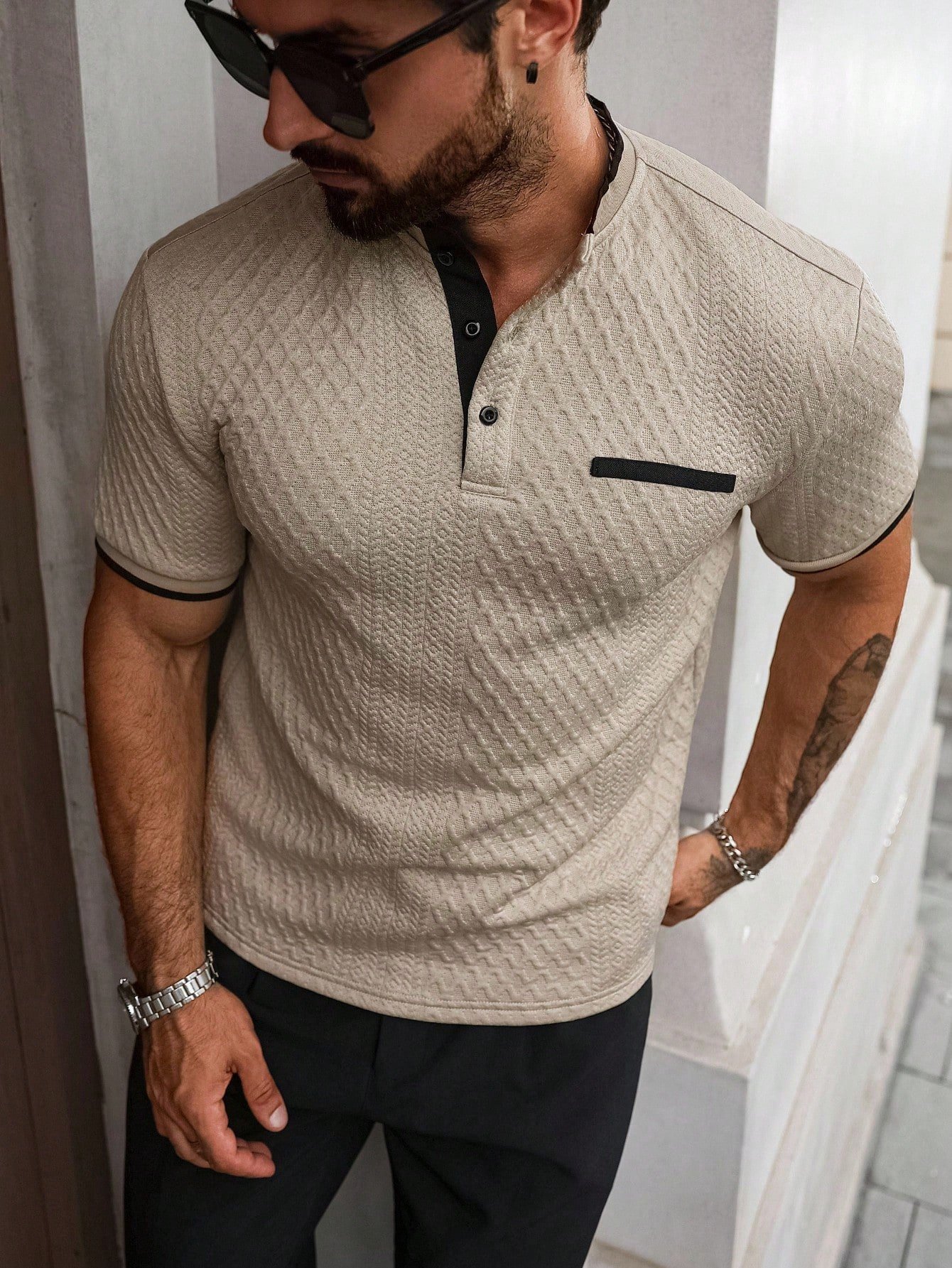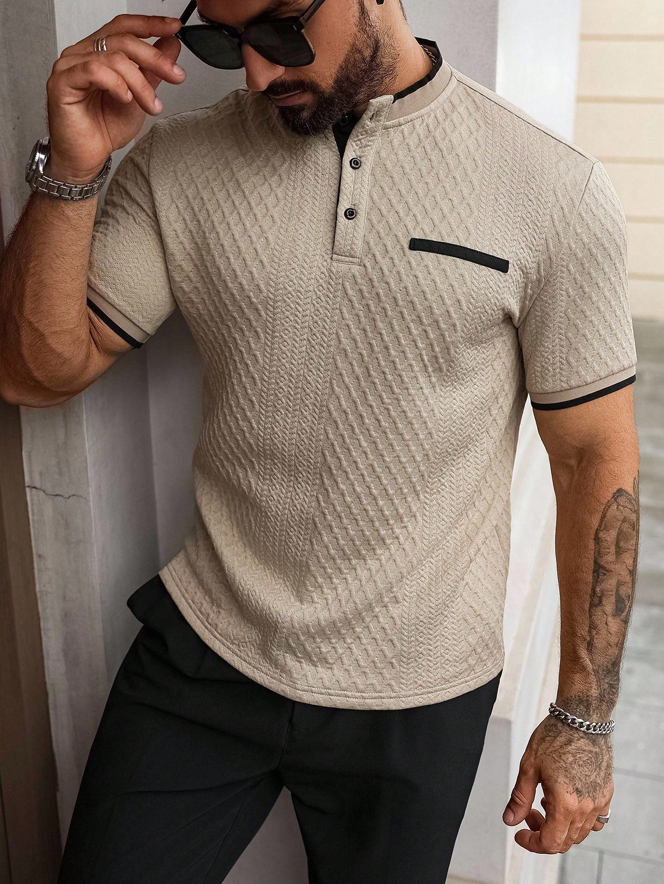 Original price was: $160.00.$80.00Current price is: $80.00.Men’s Apricot Knitted Polo Shirt – Stand Collar Colorblock Trim, Sports & Casual Summer Style
